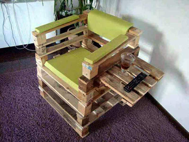 Высокое кресло, сделанное из нескольких деревянных паллет, с маленьким столиком в подлокотнике – отличный вариант для обустройства уютного уголка на даче.