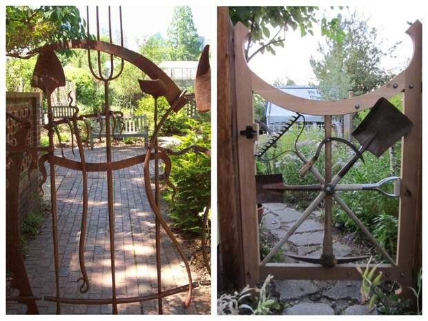 А вот еще идеи для калитки из старых садово-огородных инструментов: