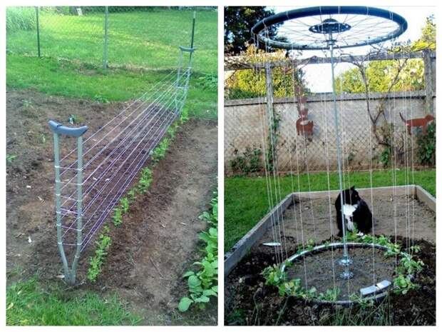 Огородники наверняка оценят вот эту практичную идею: шпалеры для вьющихся овощных культур (можно, кстати, и цветов — например, душистого горошка), опорами для которых служат обычные костыли или велосипедные колеса: