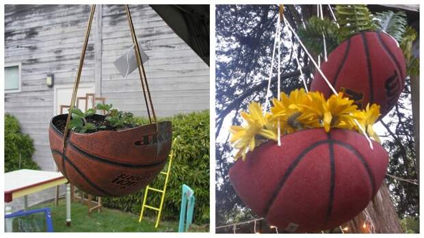 Вообще, контейнер для садовых растений, оказывается, можно сделать практически из любого предмета. Например, обычный старый мяч вполне может послужить основой для подвесного кашпо: