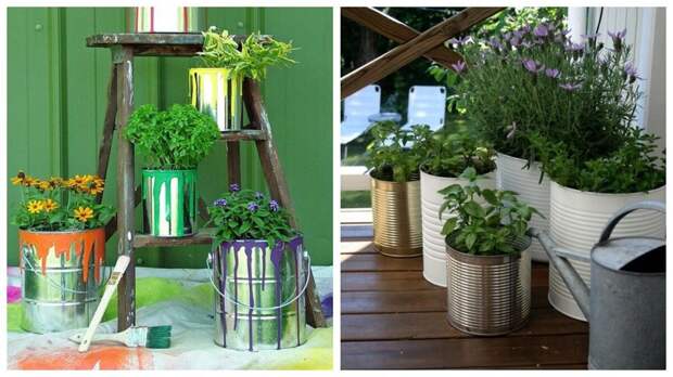 Железные ведерки и банки из-под краски могут стать контейнерами для цветов