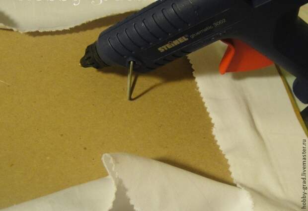 Еще один способ натянуть холст на подрамник — это посадить его на термоклей. Держится намертво, но перетянуть работу будет проблематично. Я провожу тонкую линию клея и сразу прикладываю ткань, немного прижимая. Осторожно! Клей очень горячий и даже прижав ткань, вполне можно обжечься. Используйте х/б перчатки, это убережет вас от ожогов.
