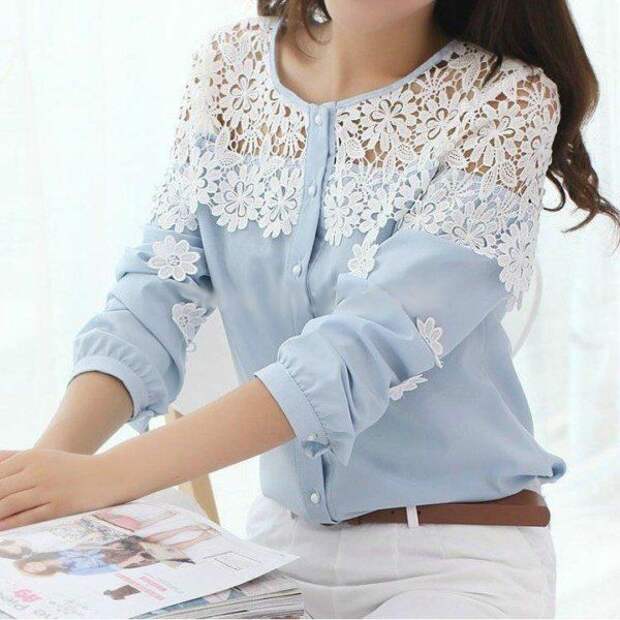Надоевшую блузку можно превратить в новое платье при помощи кружевных вставок.