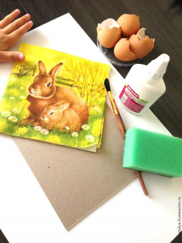 5. Теперь аккуратно совмещаем салфетку с заготовкой из нашего картона. Т.е. приклеиваем салфетку на картон со скорлупой.