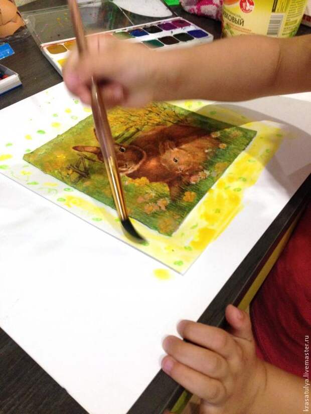 Затем намазываем клей ПВА на оборотную сторону картины и приклеиваем к приготовленному листу - рамке.