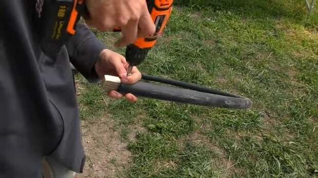 В качестве основы использовали шланг. Понадобилось сделать два кольца. Чтобы соединить концы, в отверстия вставили деревянный чопик и закрепили стыковку саморезами изнутри и снаружи на обоих концах.