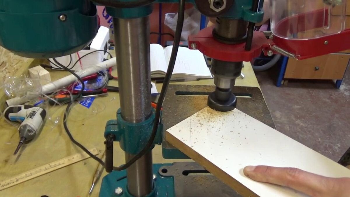 Зажимаем коронку в сверлильный станок и срезаем уголки на отрезке. Если станка нет, то можно воспользоваться дрелью или шуруповертом.