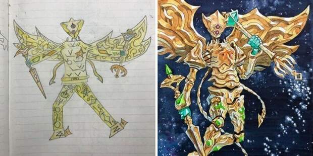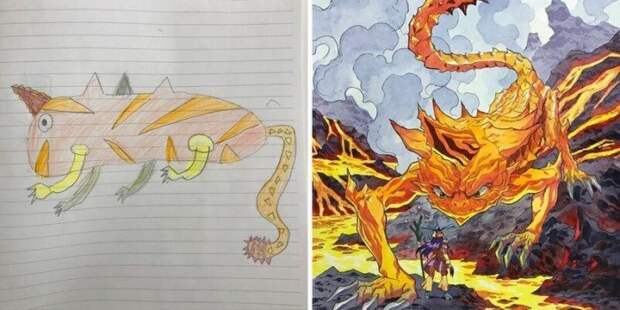 Мальчики рисуют разных странных существ (отец говорит, что не ограничивает полёт их фантазии), а сам художник выбирает некоторые наброски и превращает их в эпичных монстров.