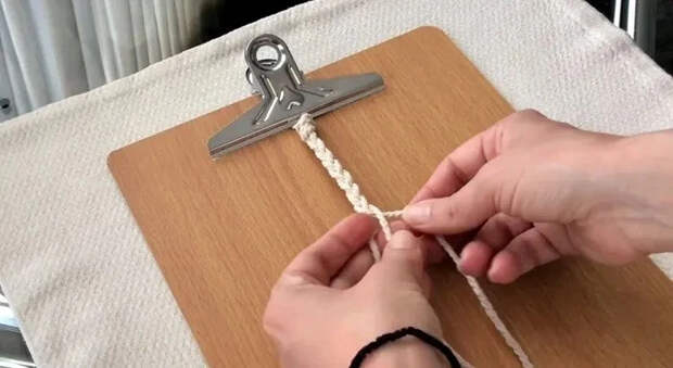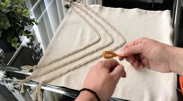 Отрежьте 3 длинных отрезка верёвки. Свяжите их концы в узел и заплетите плотную косу. Проверяйте косу по длине, чтобы её хватило на диагональную линию для вашей наволочки. Когда коса будет достаточной длины, свяжите концы верёвки узлом и обрежьте.