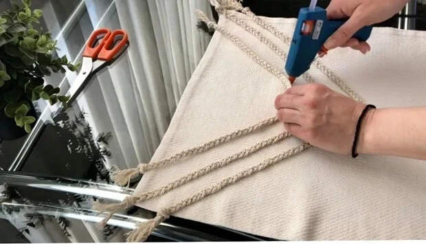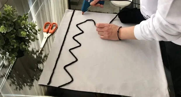Проведите ровную полоску клеем из пистолета вдоль верхнего края наволочки и приклейте отрезок пряжи.