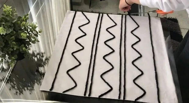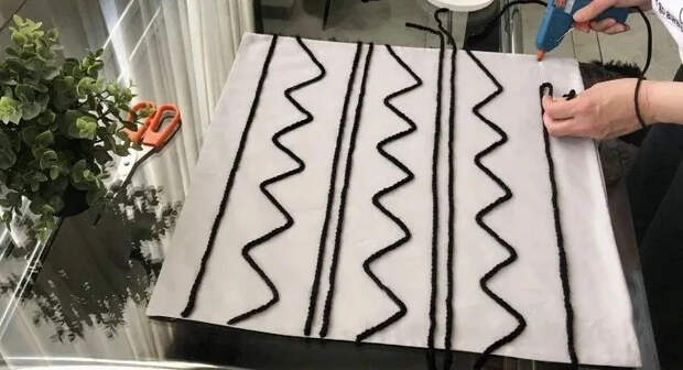 Продолжайте: приклейте ещё две ровные параллельные полосы, затем «нарисуйте» пряжей зигзаг, и так далее.