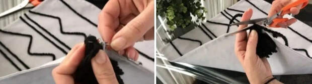 Пришейте кисточки по углам наволочки и обрежьте лишние концы пряжи. Готово.