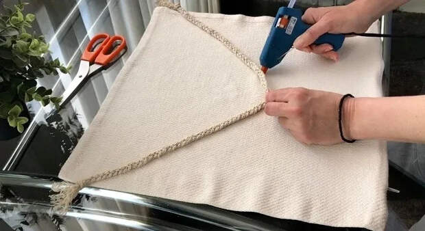 Разложите наволочку на рабочей поверхности декорируемой стороной вверх. Приложите косу, сформировав из неё угол, как показано на фото выше, и приклейте косу на горячий клей. Узлы и кончики кос должны выходить за пределы наволочки.