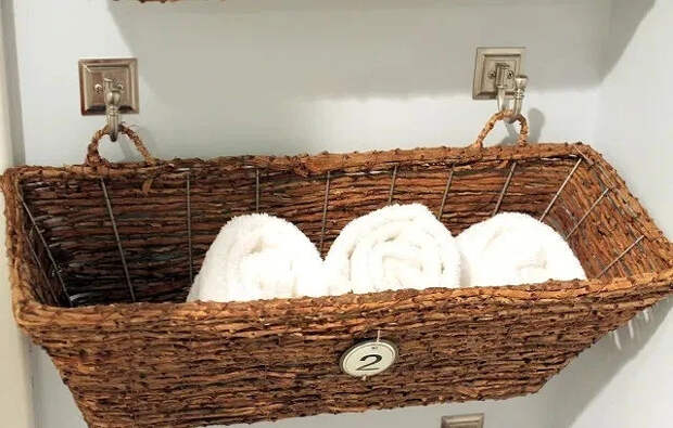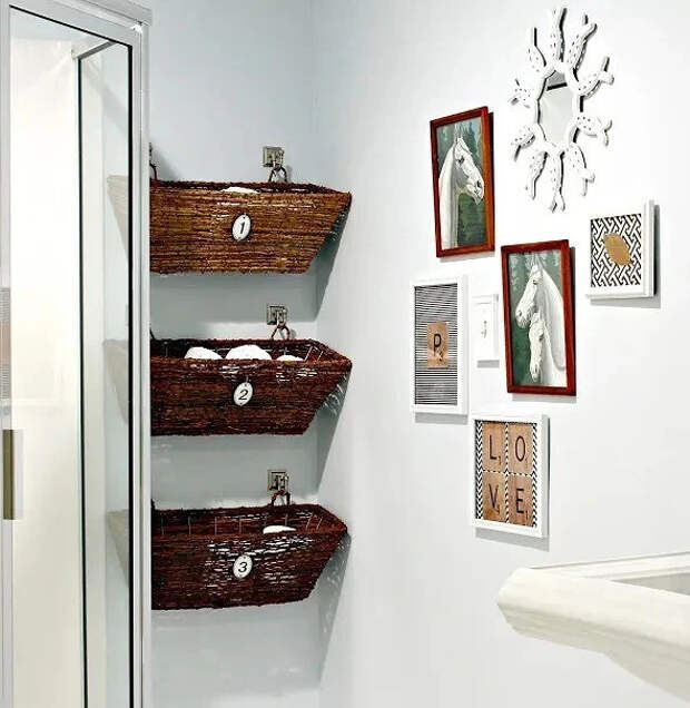Если у корзин нет петелек для подвешивания, добавьте их, а на стену повесьте красивые крючки.