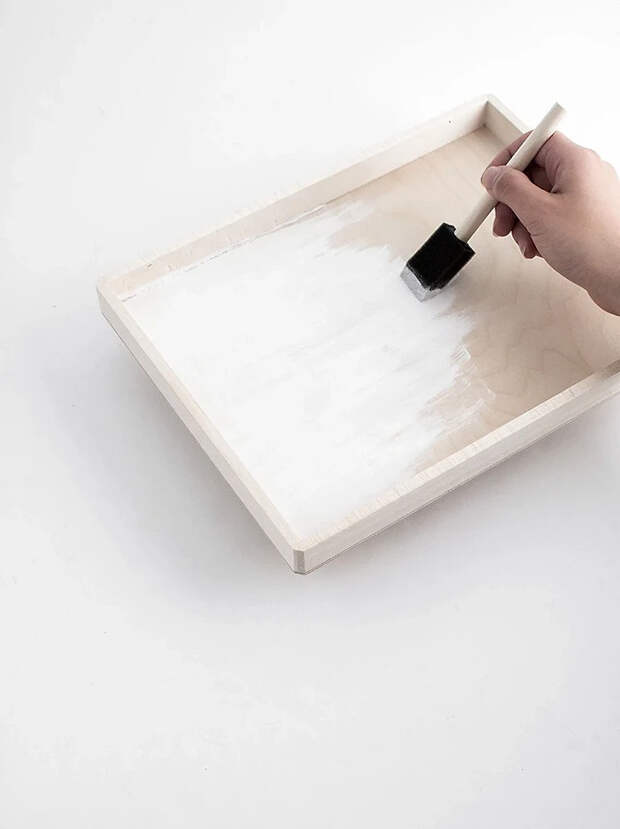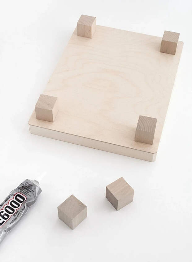 Понадобится простой деревянный поднос и 4 деревянных брусочка для ножек. Приклейте ножки снизу.