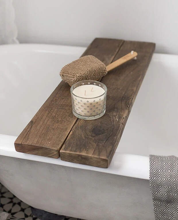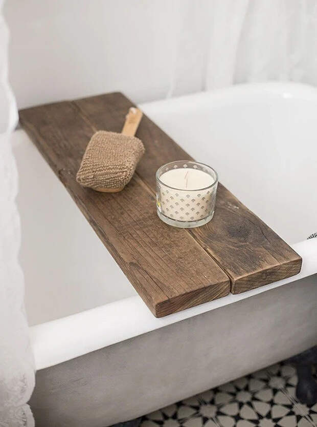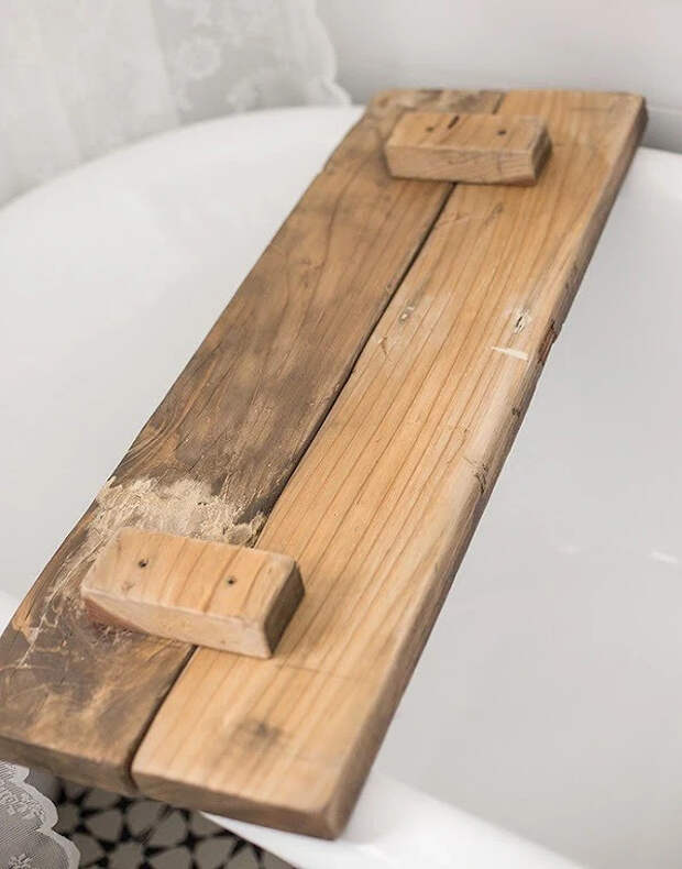 Такую полку удобно положить поперёк ванны и размещать на ней, например, книгу или напиток.
