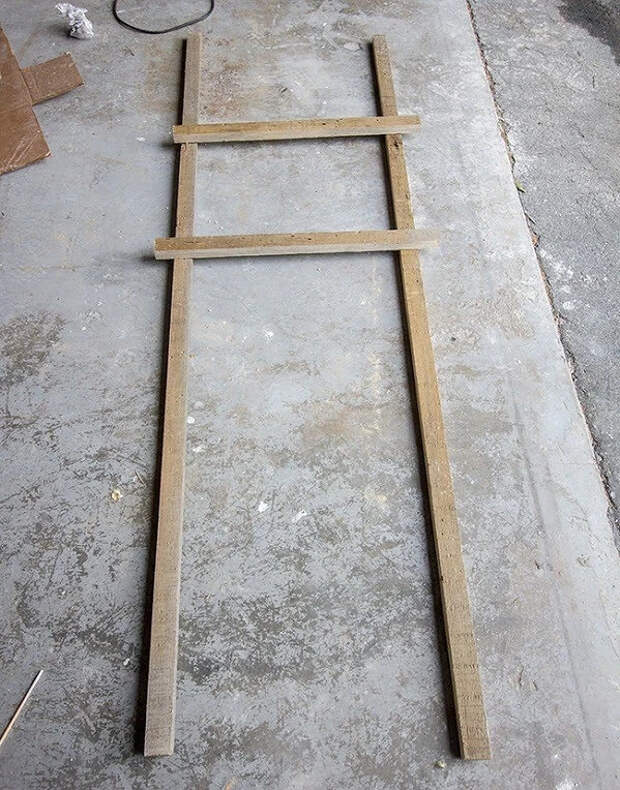 Потребуется три деревянных рейки: две в качестве основы, третья, распиленная — для перекладин.