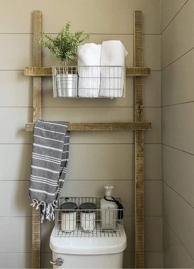 В комплект к полке из пункта выше можно сделать подобный стеллаж, который удобно установить над унитазом.