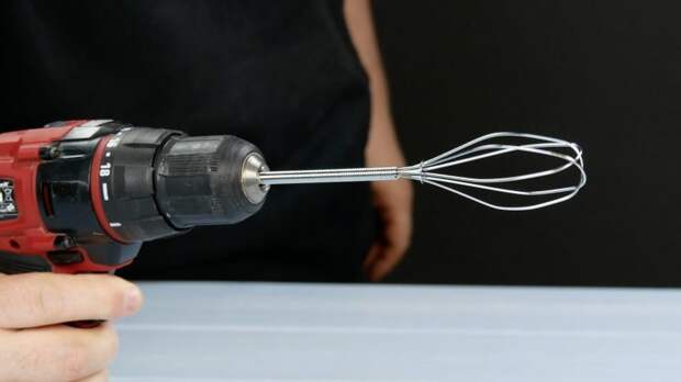 Если под рукой нет миксера, но есть шуруповерт - закрепляем в нем венчик и без проблем взбиваем все, что нужно.