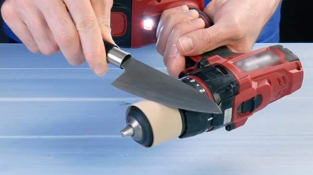 Кстати, дрель-шуруповерт можно превратить еще и в машинку для заточки ножей. Для этого клеим на вращающуюся часть головки кусочек наждачной бумаги.