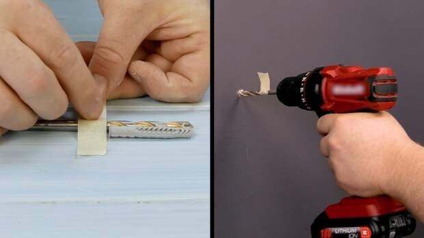 Еще один простой и полезный лайфхак: чтобы точно знать, до какой глубины сверлить отверстие, измерим длину дюбеля и отметим длину на сверле кусочком изоленты.