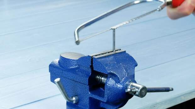 Пилой обрезаем шляпку гвоздя, а затем сгибаем его под прямым углом с помощью тисков и плоскогубцев.