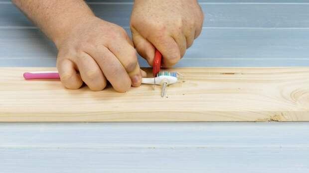 Все просто: в зубной щетке, прямо в центре головки просверлим отверстие, а затем вставляем в него шуруп.