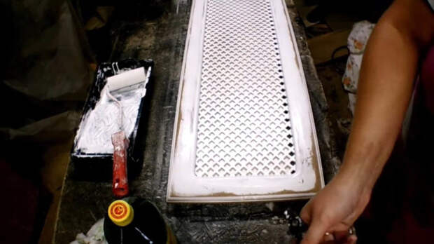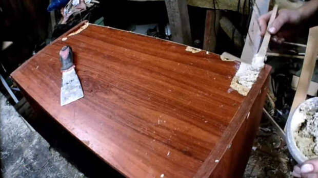 Сверху всё замазать шпатлёвкой, выровнять шпателем и наждачной бумагой.