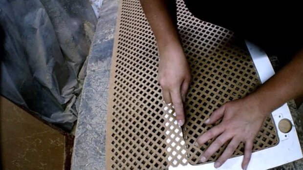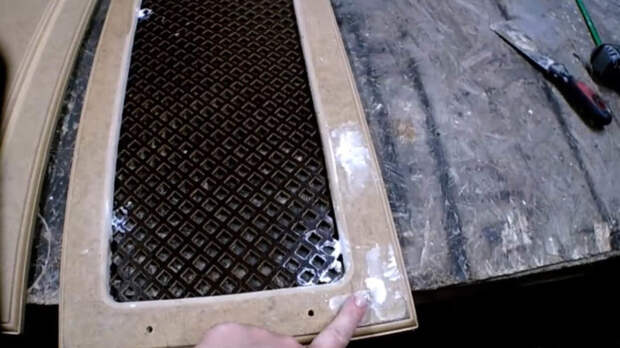 Решётку из ДВП подрезать по размеру дверцы, отрезать лишнее. Вклеить и закрепить дополнительно мебельным степлером с обратной стороны дверцы.