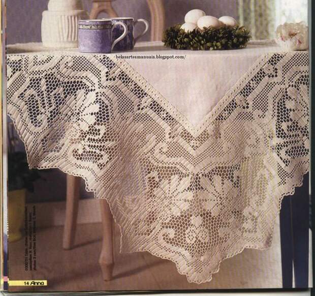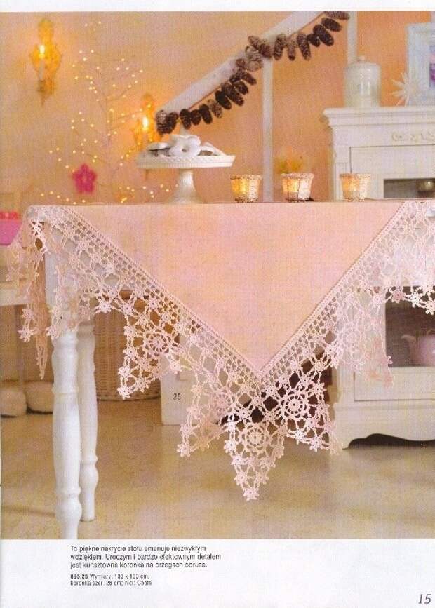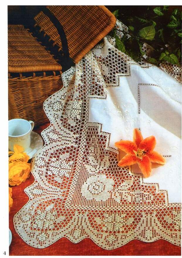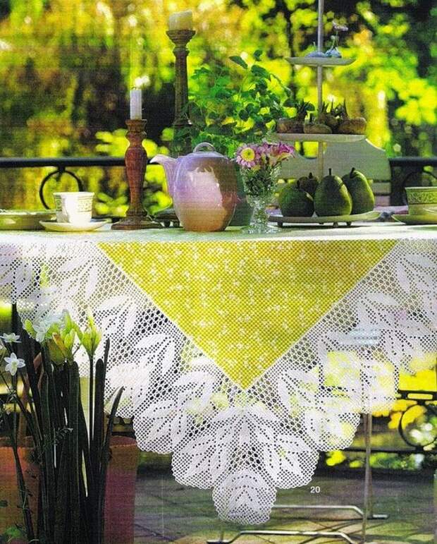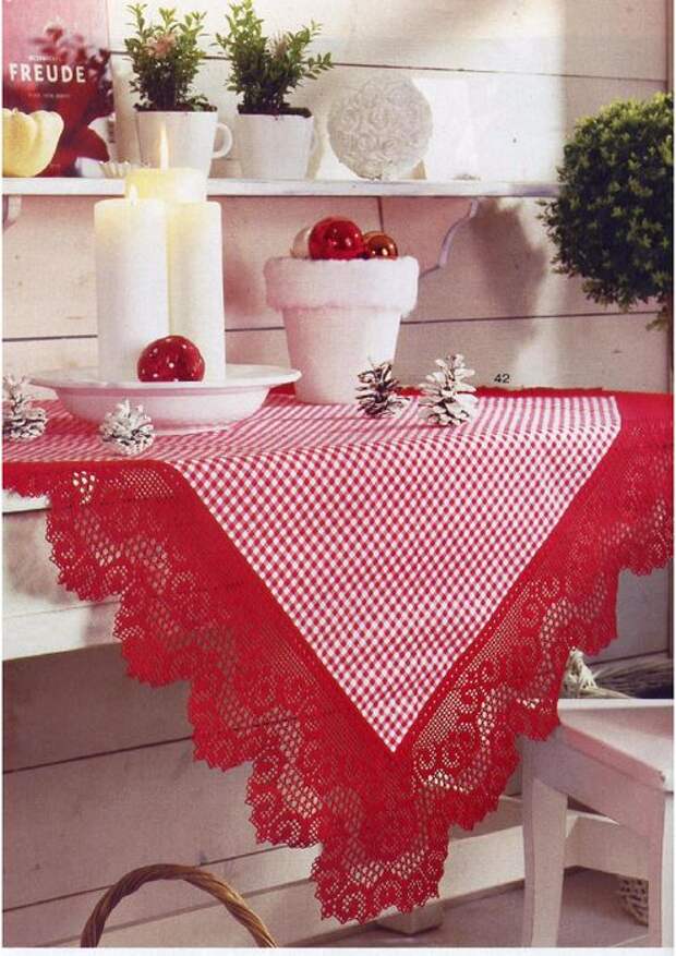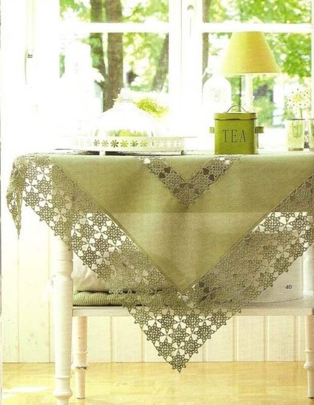Соединение ткани с вязанием — интересная комбинированная техника, позволяющая создавать оригинальные вещи и изделия для дома. Особенно хорошо в этой технике получаются скатерти — нарядные, красивые, создающие атмосферу уюта и порядка в доме.