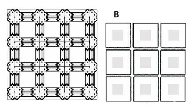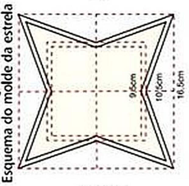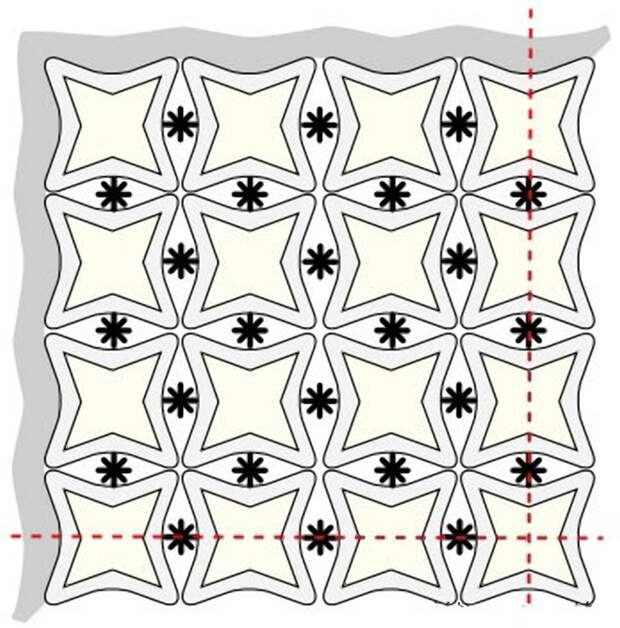 Для этого нужно раскроить квадрат со стороной, например, 16,5 см, в центре разметить квадрат с меньшей стороной, примерно 10 см. Свернуть квадрат пополам и ещё раз пополам (по линиям сгиба на рисунке). На линиях, указанных штрихами (по сгибам), отметить одинаковые расстояния от края к центру большего квадрата. Провести линии, как на схеме, и вырезать вогнутый ромб.