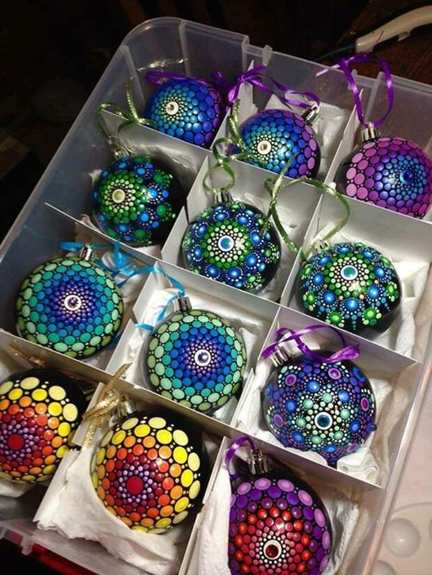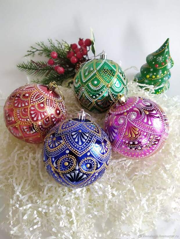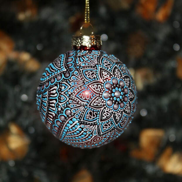 Точечная роспись делает такие игрушки оригинальными и уникальными. Праздничный уют и эксклюзивная ёлочка вам обеспечены. Также такой сувенир станет чудесным подарком для друзей и коллег по работе.