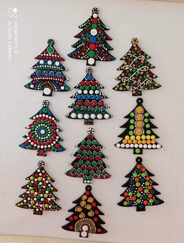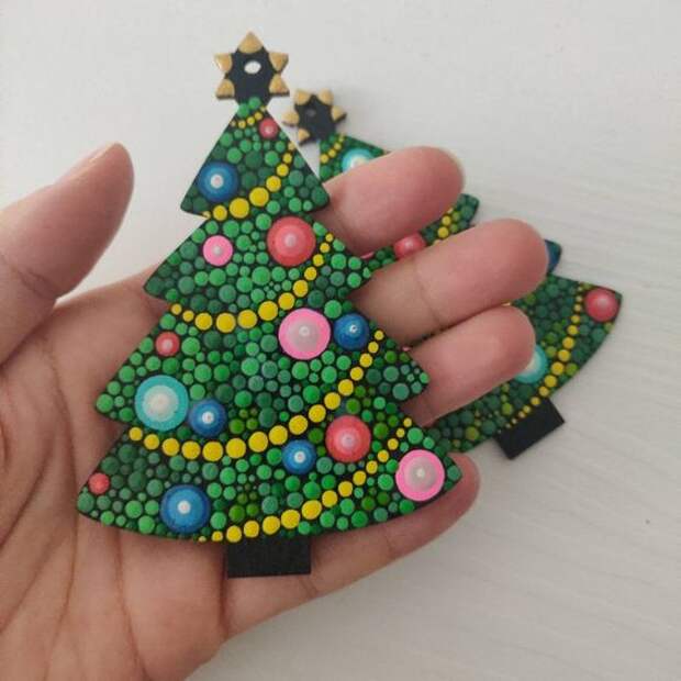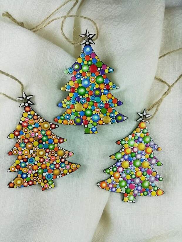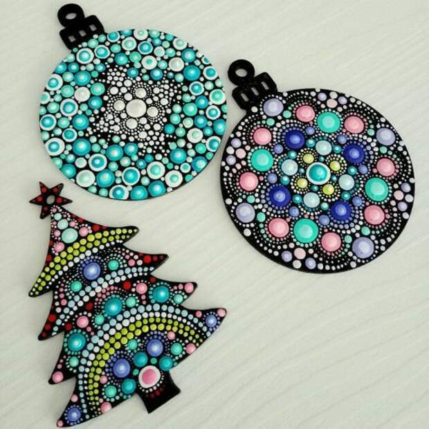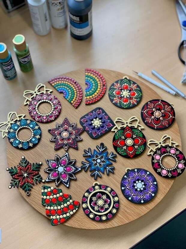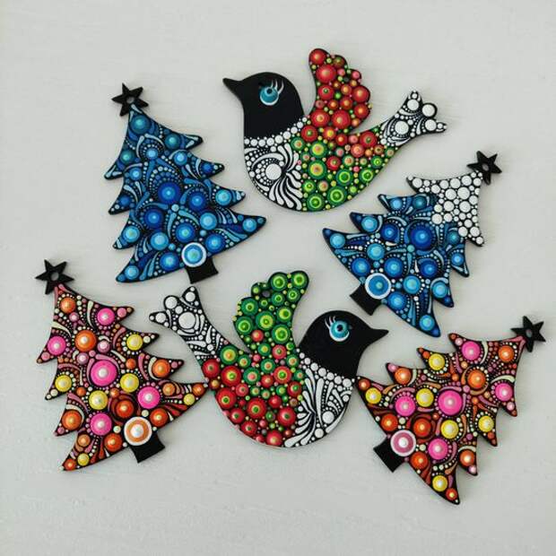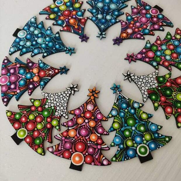 Расписывать можно не только шары. Потрясающе смотрятся деревянные ёлочные игрушки, выполненные в технике точечной росписи. Готовые деревянные заготовки можно купить в любом магазине для творчества и вдохнуть в них новую жизнь.
