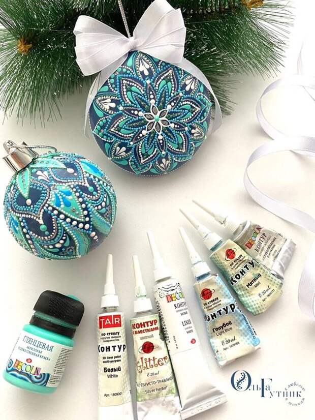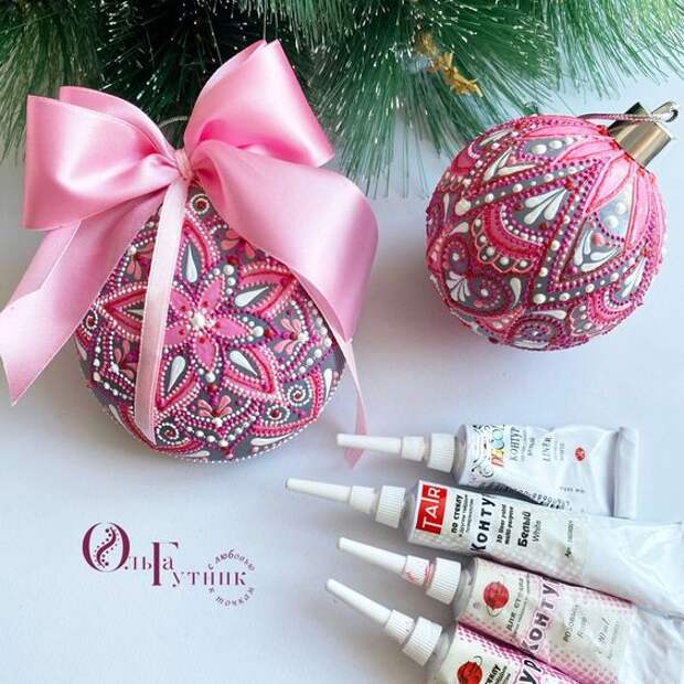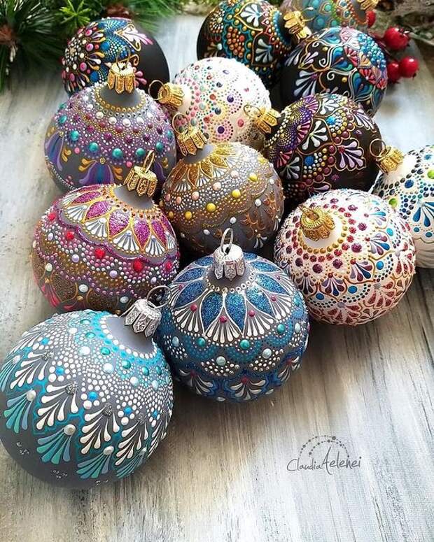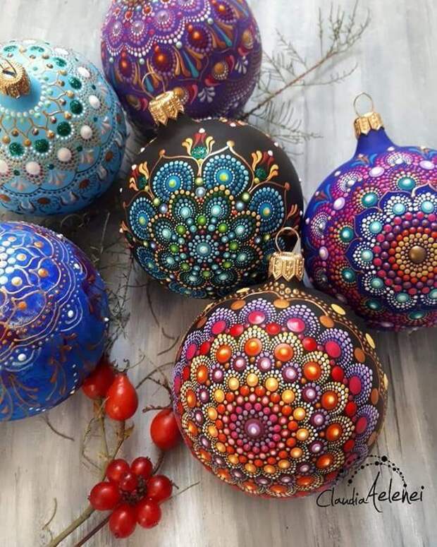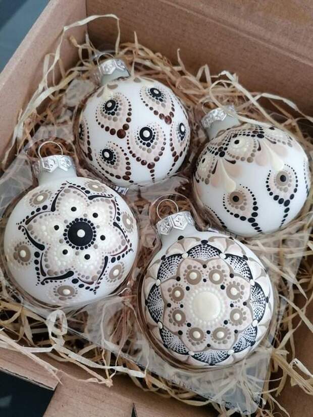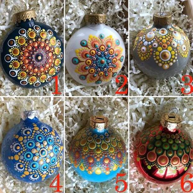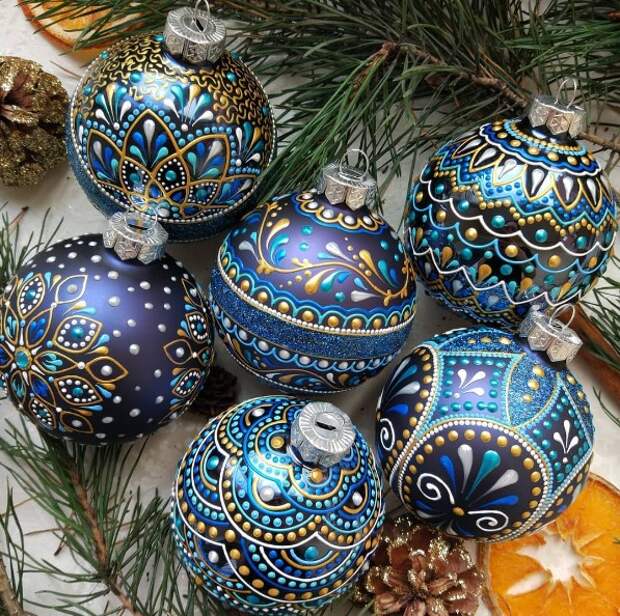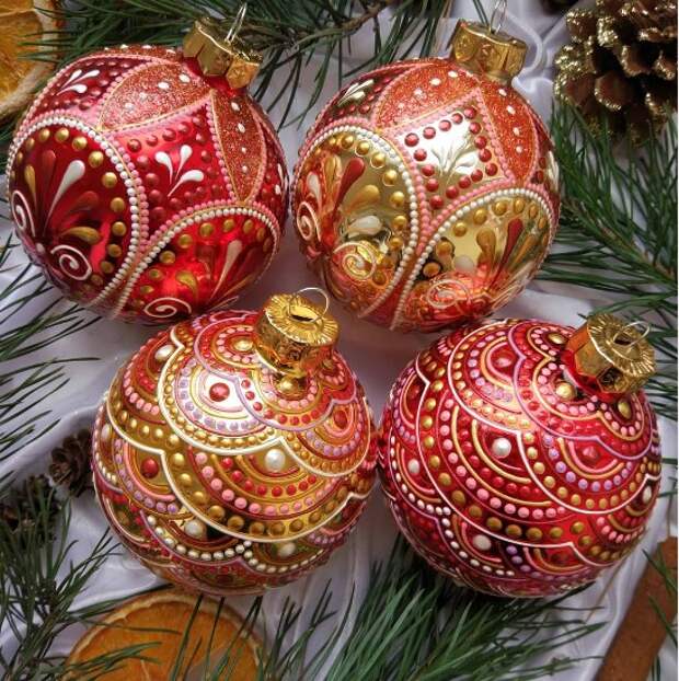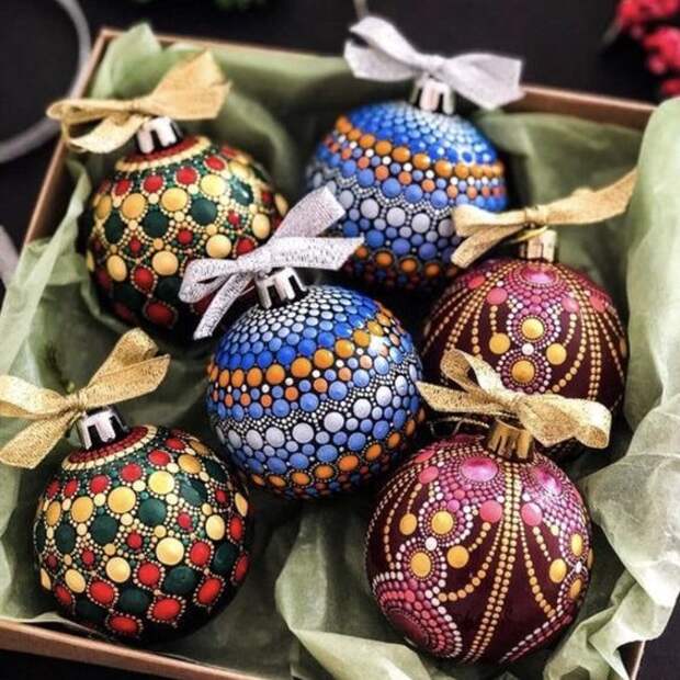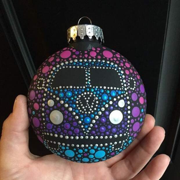 Один из самых простых приемов декорирования — точечная роспись новогодних шаров. Ёлочная игрушка получается невероятно красивой, яркой и оригинальной. Маленькие точечки, которые сливаются в один большой рисунок, создают на шарике оригинальную текстуру.