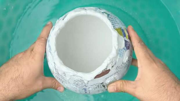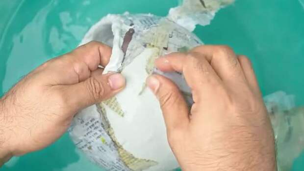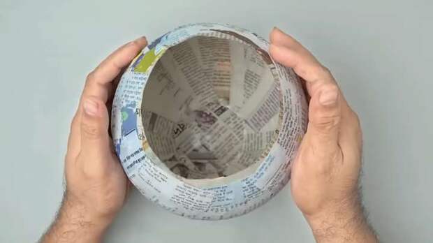 Надуйте воздушный шар, оклейте его кусочками бумаги (газеты), смоченными в клее ПВА пополам с водой. Сделайте 2-3 слоя, дайте полностью просохнуть.