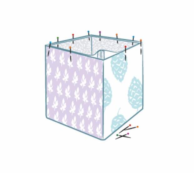 Повторите шаги 1 и 2 для подкладки. Возьмите готовую подкладку поместите внутрь внешнего куба изнаночными сторонами друг к другу. Выровняйте срезы и швы и сколите. Сметайте с припуском 5 мм.