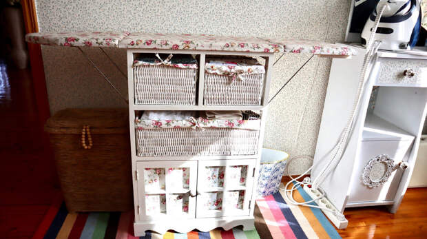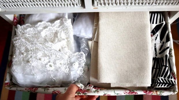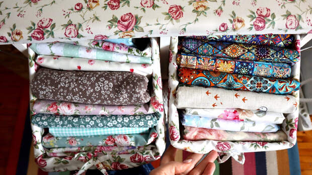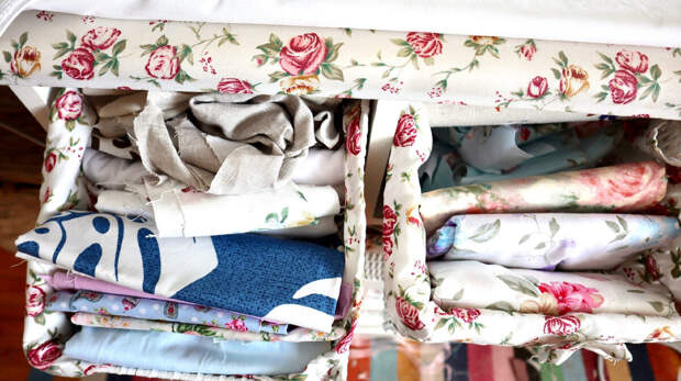 - Целые куски ткани сложены вертикально в ящичках на гладильной доске.