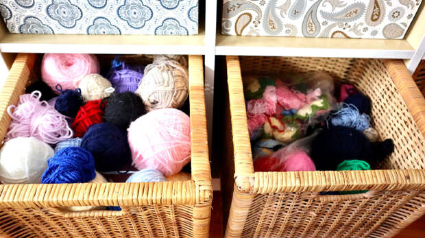 - В этот раз переложила пряжу на полку, раньше она лежала в чемоданах. Теперь в чемоданах хранятся материалы, ткань, бисер, нитки мулине, разные приспособления, которые редко нужны.