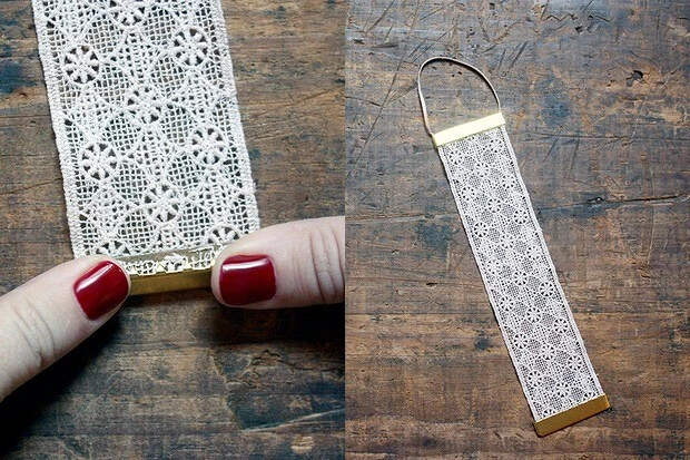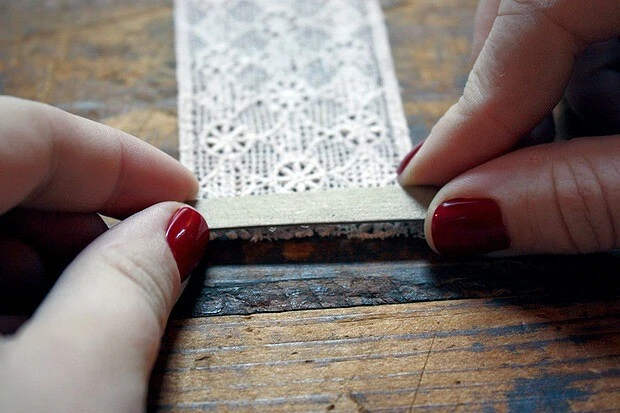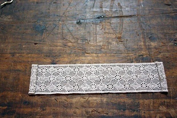 2. Отрежьте по кусочку картона шириной, равной ширине держателей, и приклейте к кружеву, как показано на фото.