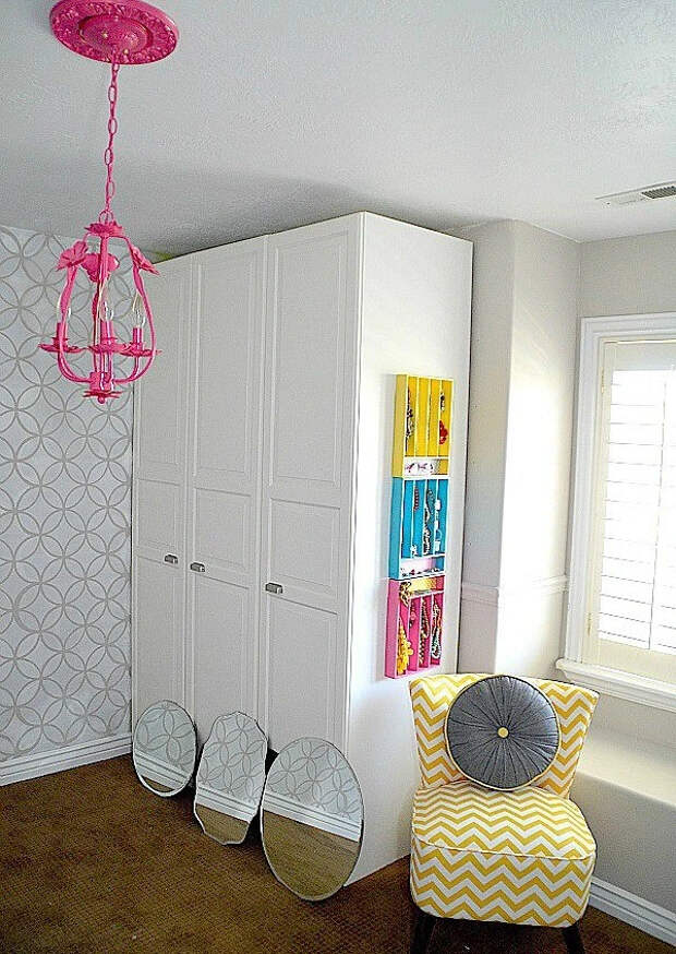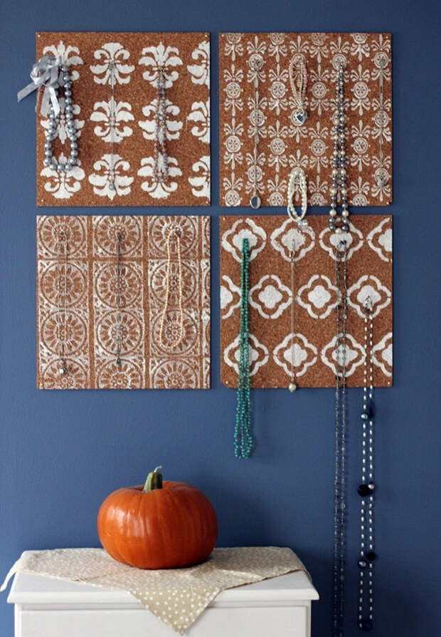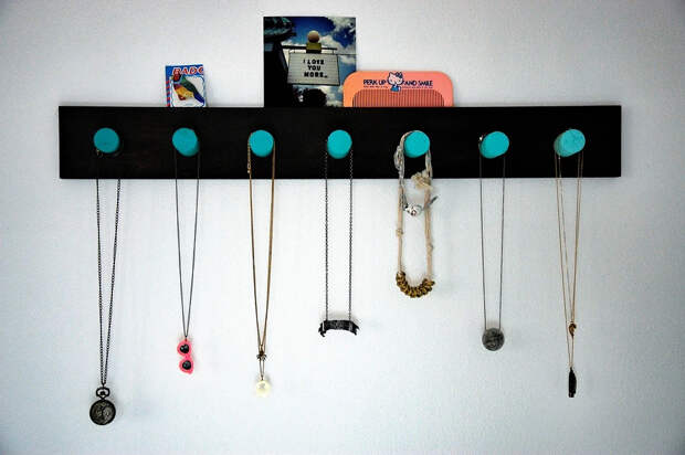 2. Дождитесь высыхания краски и воткните в дощечки булавки, гвоздики или вверните крючки. Останется закрепить органайзеры на стене и развесить украшения.