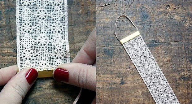 3. Свяжите шнурок в кольцо, проденьте его через держатель и закрепите держатель на полоске кружева.