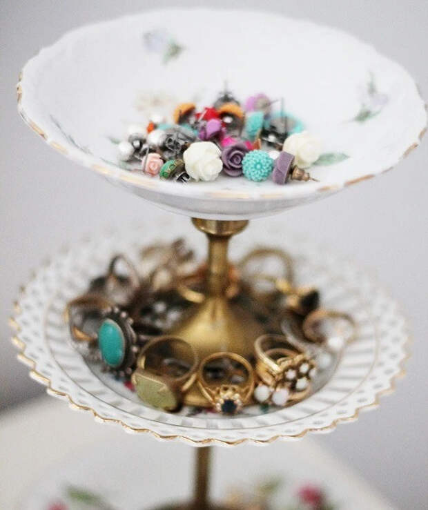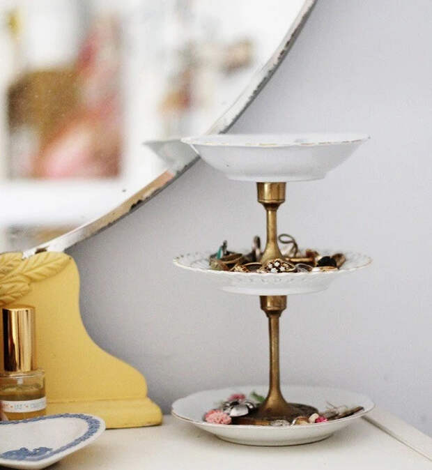 Несколько блюдец, оставшихся без чашек, плюс подсвечники — получается красивая подставка для украшений в винтажном стиле.