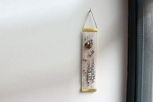 Из-за медных аксессуаров и специально состаренного кружева этот органайзер выглядит, как вещица, найденная в бабушкином сундуке или отысканная на барахолке. Хранить на нём удобно всё, что имеет крючки: серьги, броши, значки.