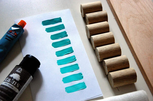 2. Каждый брусочек-крючок будет покрашен в свой цвет, от самого тёмного к светлому. Для достижения такого эффекта покрасьте первый брусочек исходным цветом, а для каждого следующего добавляйте к краске белого.