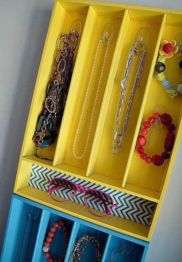 Такие лотки обычно кладут в кухонный ящик, чтобы хранить в них столовые приборы. Однако с их помощью можно сделать удобные полочки-органайзеры для хранения украшений и мелочей.