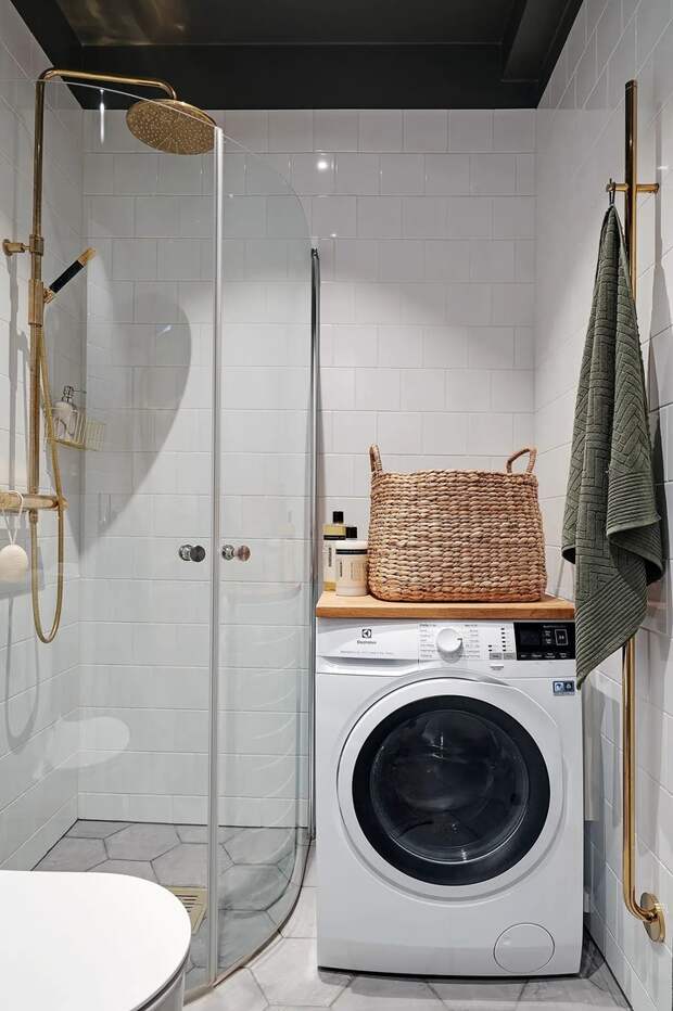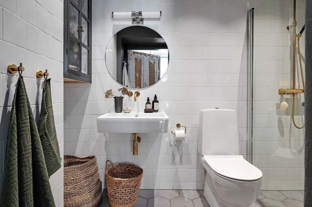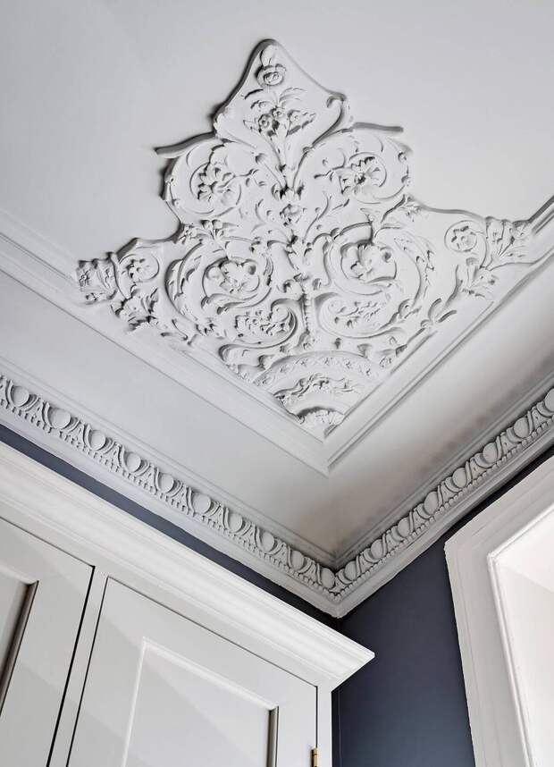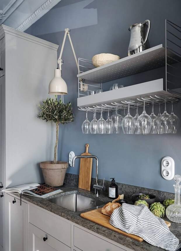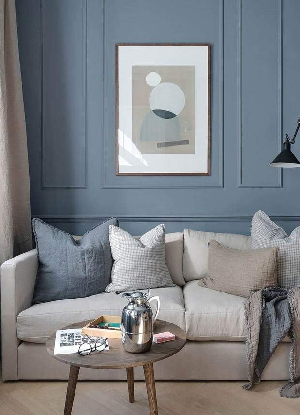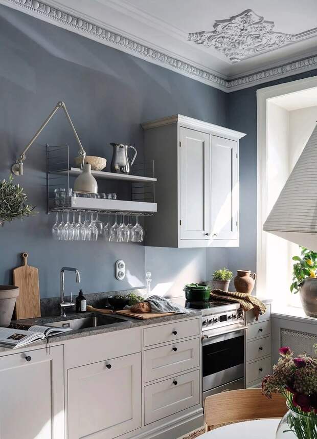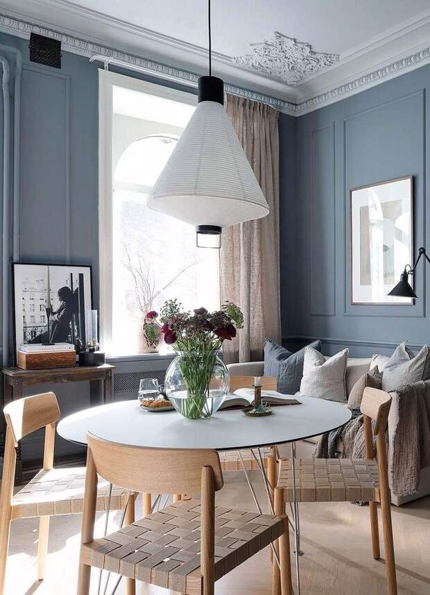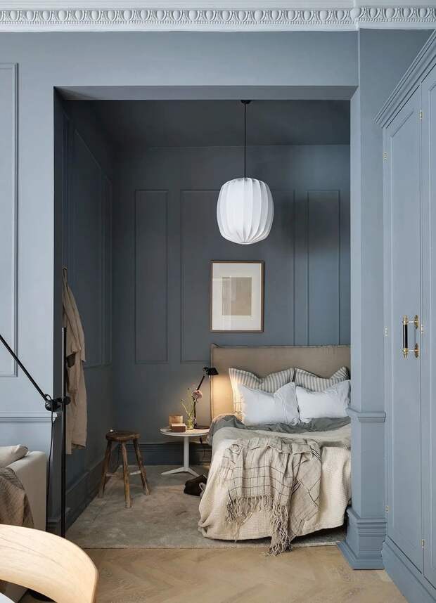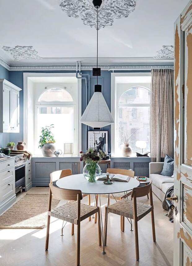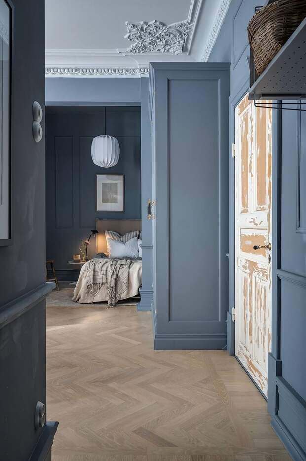 Молдинги на стенах, лепнина на потолке, элегантная мебель и благородным паркет «елочкой» — эта роскошная квартира-студия в Гетеборге сочетает в себе современность и традиционные вневременные элементы классики. Но в отличие от типичных белых нордических интерьеров, стены здесь окрашены в сложный и интересный серо-голубой цвет под названием “Shadow Blue” от Jotun, а потолок - в светлый серый оттенок.