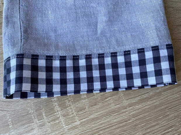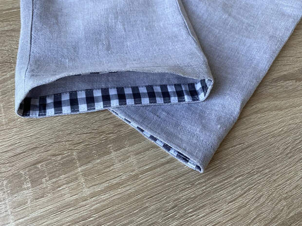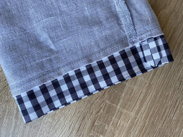 Фальшивую подгибку настрочите по краю на швейной машинке или подшейте вручную потайным стежком.
