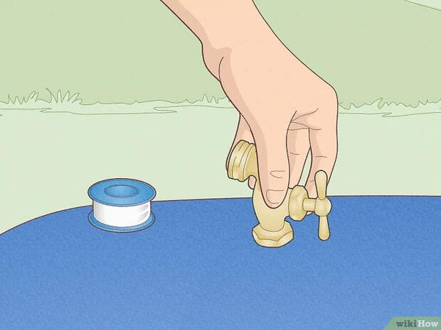 - Подсоедините водоразборный кран. Соедините его со стяжкой. Используйте тефлоновую ленту, чтобы плотно соединить их и избежать протекания. Установите кольцевую прокладку на конец с нарезкой и проденьте в отверстие с наружной стороны. С внутренней стороны наденьте другую кольцевую прокладку. Подсоедините изолирующую втулку, чтобы прочно удержать водоразборный кран на месте.[4]