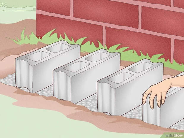 - Насыпьте слой мелкого гравия.[2] Это поможет воде не застаиваться вокруг ваших контейнеров и не затопить основание вашего дома. Выкопайте 10-12 см углубление в форме прямоугольника, засыпьте его тонким слоем гравия и поставьте бочки.