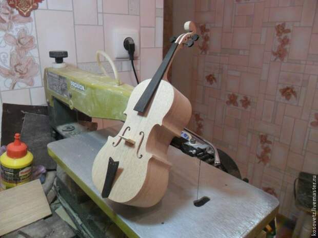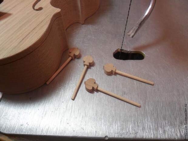 Выпиливаю эфы на крышке шкатулки (эфами называют эти красивые вырезы на скрипке), колки, (колки я делал из зубочисток), струнодержатель, подставку и гриф.
